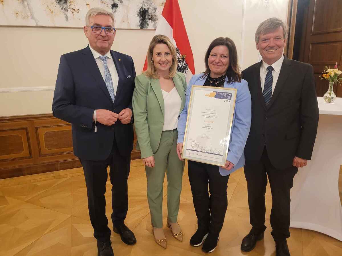 Die Initiative „Fixe Anstellung einer ‚Alltagshelferin‘“ in Oberndorf in Tirol wurde vom Bundeskanzleramt mit dem zweiten Platz des Österreichpreises „Gemeinden für Familien“ ausgezeichnet. Im Bild (v. l.): Gemeindebund-Präsident Alfred Riedl, Ministerin Susanne Raab, Cornelia Trixl und Oberndorfsbürgermeister und Ideengeber Hans Schweigkofler.