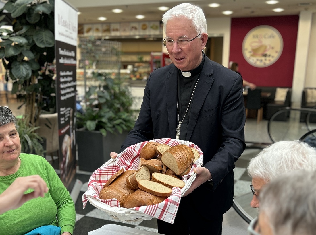 Wörgl. Das traditionelle Fastensuppenessen der Katholischen Frauenbewegung in Wörgl veranlasste Erzbischof Franz Lackner Mitte März zu einem Besuch im Tiroler Teil der Erzdiözese – inklusive herzlichem Dank für „das beständige Engagement“. Die Benefizveranstaltung mit dem Projekt-Schwerpunkt Nepal war gut besucht. Im Bild der Salzburger Erzbischof beim Verteilen des Brotes.