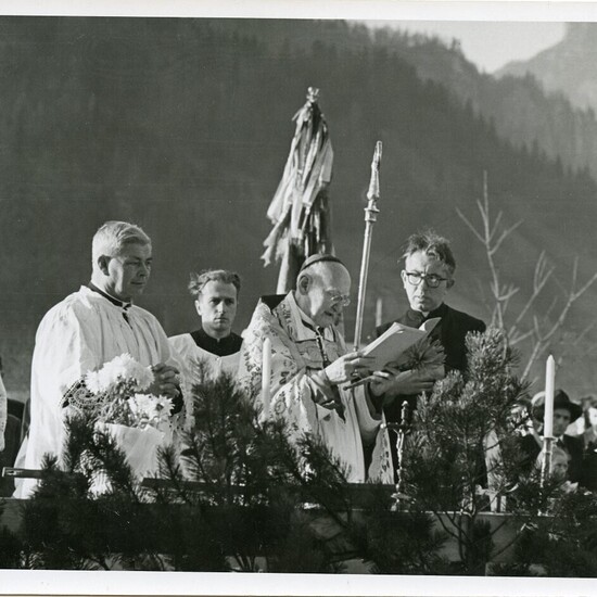Empfang des Weihbischofs Johannes Filzer 1955 zur Turmkreuzweihe der damals neuen Kirche zur Hl. Barbara.