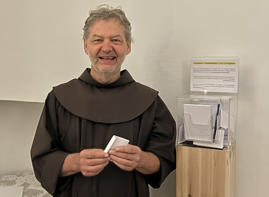 - In der Salzburger Franziskanerkirche wird das 1.000ste Gebetsanliegen an den heiligen Engelbert Kolland eingeworfen (im Bild oben Pater Fritz Wenigwieser, Provinzialminister der Franziskaner).