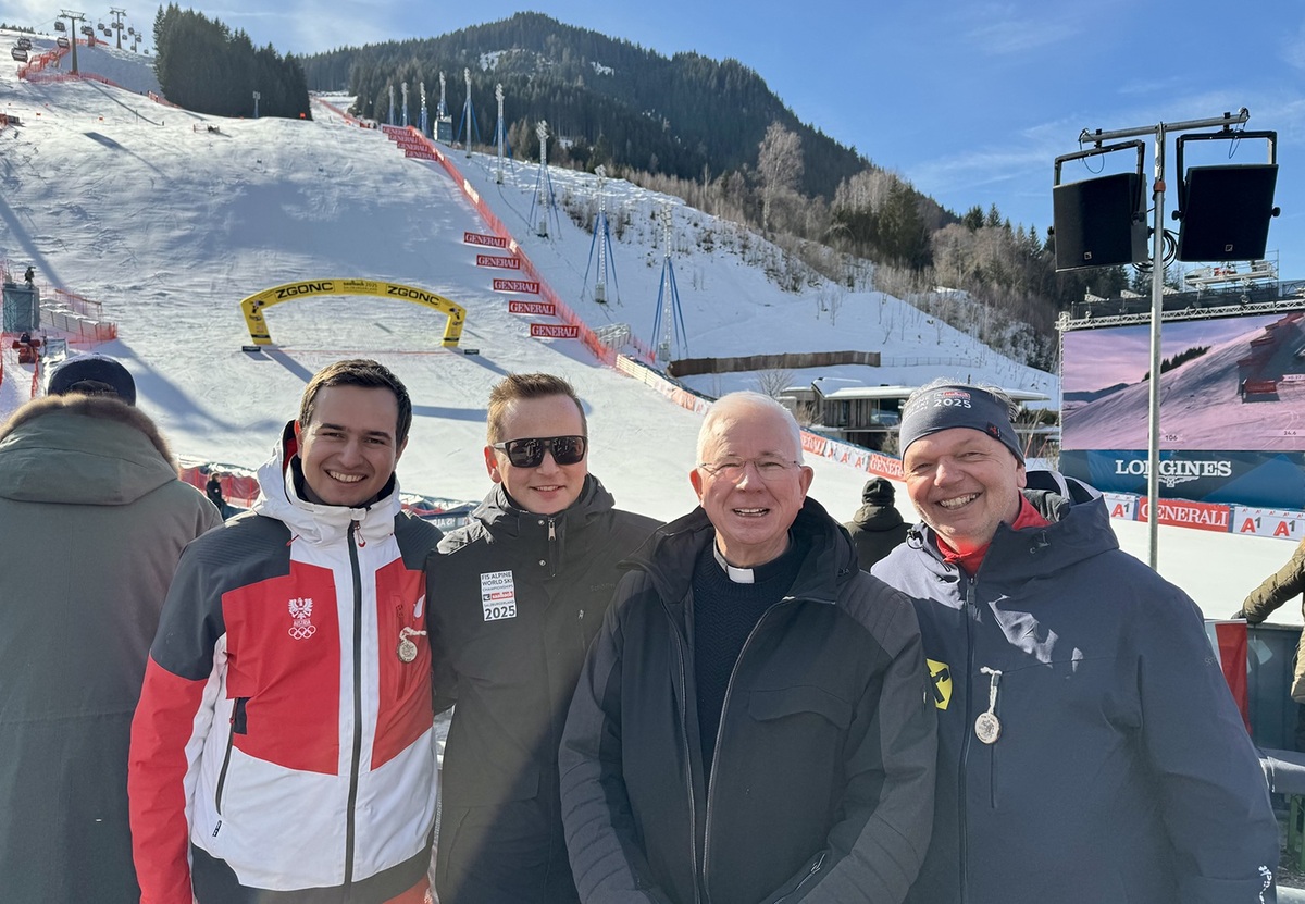 - Bei der Ski-WM in Saalbach sind auch Pfarrer Rudolf Weberndorfer und etliche mitarbeitende Pfarrmitglieder im WM-Fieber. Im Bild von links: Olympiaseelsorger Johannes Lackner, Alois Hasenauer (Bürgermeister Saalbach-Hinterglemm), Erzbischof Franz Lackner und Pfarrer Rudolf Weberndorfer.