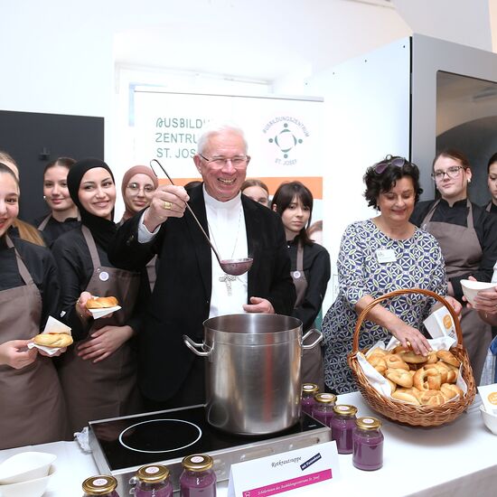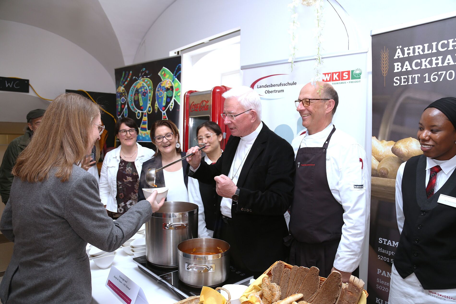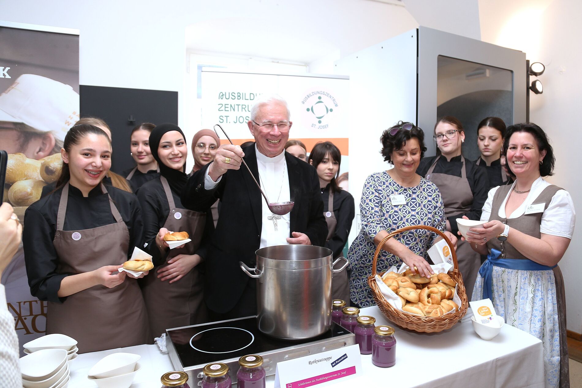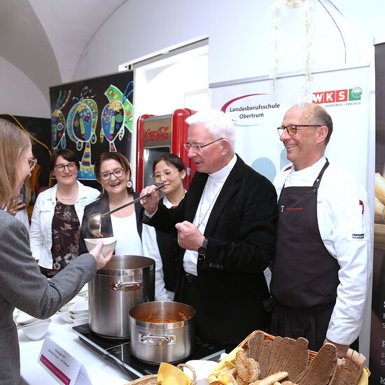 Auf die Gäste warteten neben der Fastenspeise aus dem Hause Maier zwei weitere Kreationen, die junge Köchinnen und Köche zubereitet hatten: eine Krautsuppe der Landesberufsschule Obertrum sowie des zweiten Jahrgangs der Höheren Lehranstalt für wirtschaftliche Berufe des Ausbildungszentrums St. Josef. Die Katholische Privatschule steuerte außerdem wieder Fastenbrezen bei. Für den reibungslosen Service sorgten Studierende des „Institute of Tourism & Hotel Management“ der Tourismusschulen Salzburg.