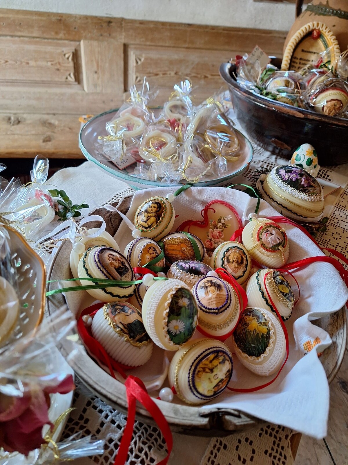 Kein Kunstwerk gleicht dem anderen. Die Wachswicklerin probiert ständig Neues aus – „sonst wird es langweilig“. Heuer setzte sie eine besonders kreative Idee um: „Heiligenbilder hinter alten Uhrengläsern, kunstvoll mit Wachs umwickelt, wurden zu einzigartigen Medaillons“, berichtet die Tirolerin stolz. Sie hat auch schon Eier mit Frühlingsblumen verziert oder Kartoneier bemalt und wie Fastenkrippen befüllt.