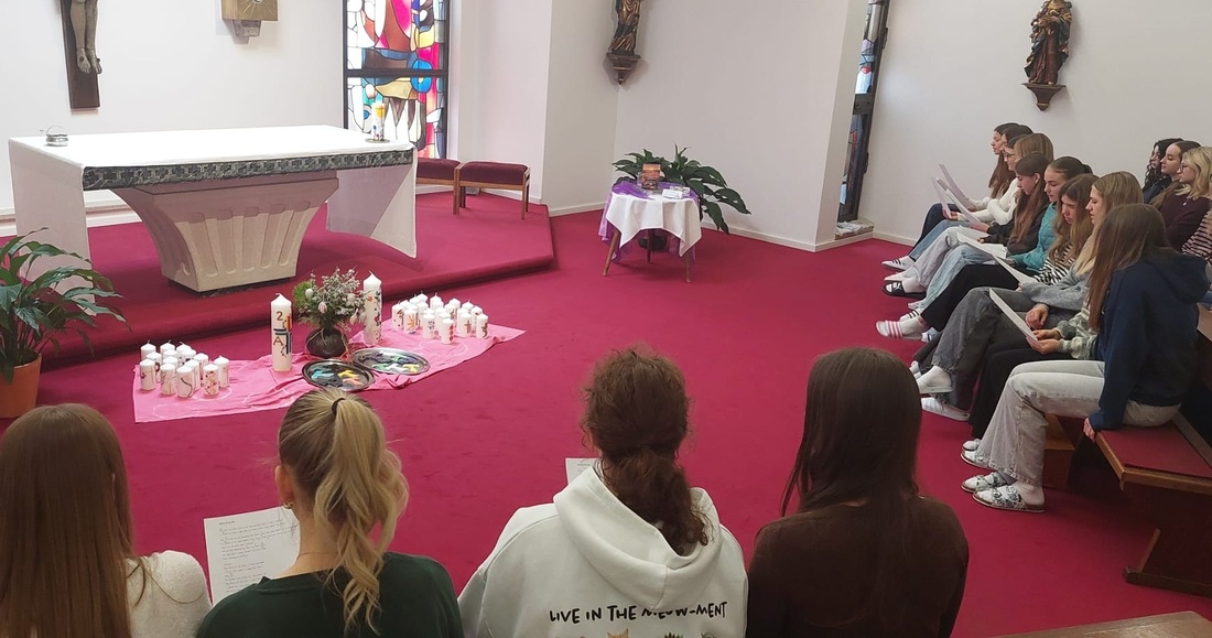 Im Sinne des heiligen Franz von Assisi erarbeiteten die Fachschülerinnen im Rahmen eines großen Friedensprojektes Tau-Kreuze aus Ton als Zeichen des Friedens und des Segens. Abschließend wurden die Kerzen und die Tau-Kreuze von P. Richard Cardozo in der Kapelle (im Bild) feierlich gesegnet.