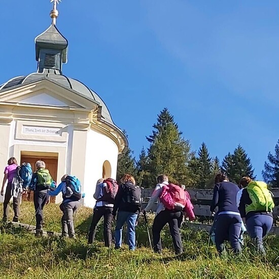 Pilgern im Pinzgau: Pilgerbegleiterin Claudia Huber (l.) war bergwärts mit ihren Pilgerinnen unterwegs durch Wald und über Wiesen mit einer Einkehr bei der Wallfahrtskapelle Maria Elend (r.).