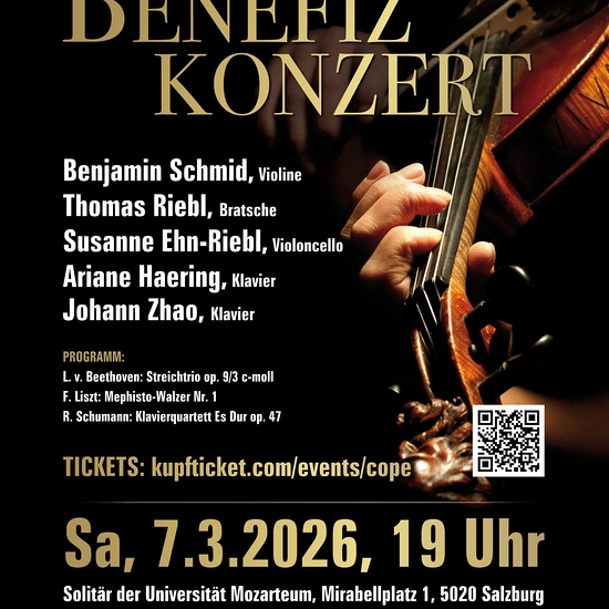 am Sa., 7. März, 19 Uhr, Solitär der Universität Mozarteum, Salzburg mit Benjamin Schmid (Violine), Thomas Riebl (Bratsche), Susanne Ehn-Riebl (Violoncello), Ariane Haering (Klavier), Johann Zhao (Klavier). Programm: Werke von L. v. Beethoven, F. Liszt, R. Schumann