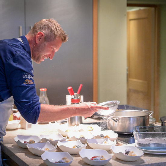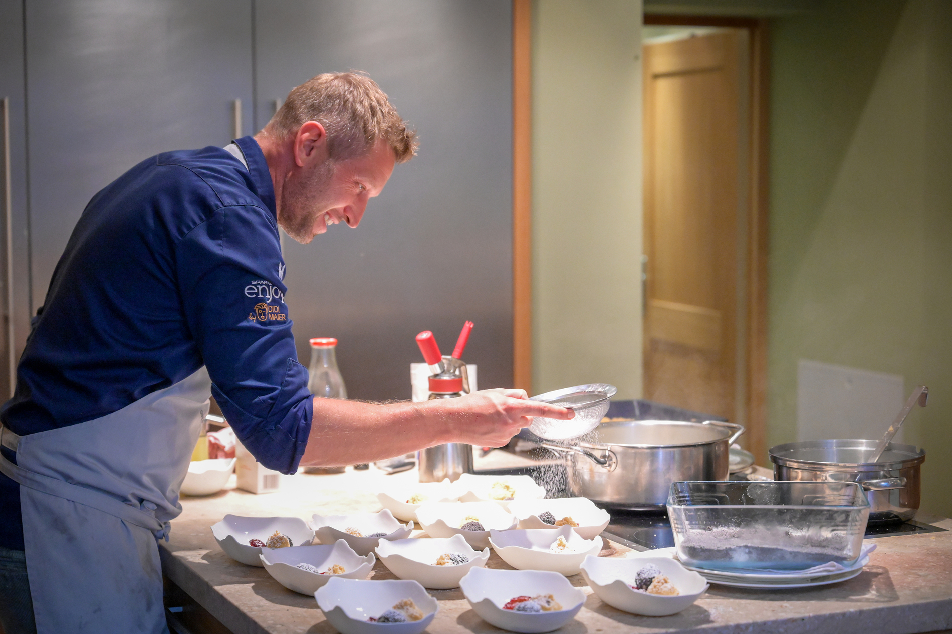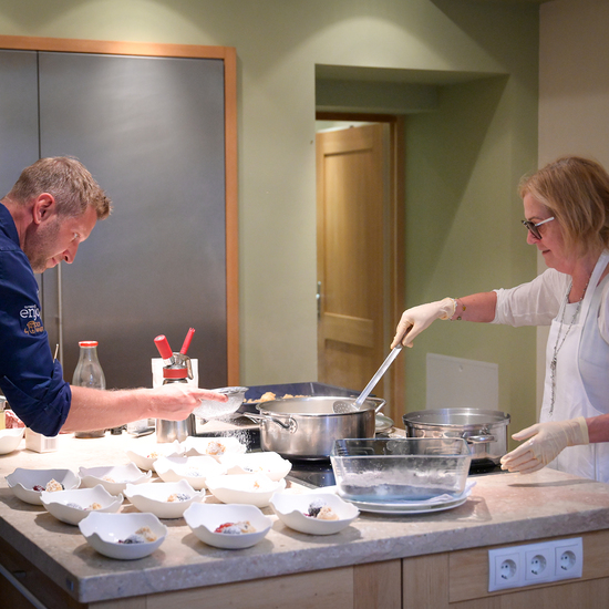 Wussten Sie, dass fangfrischer Fisch ruhen muss, bevor er in die Pfanne darf? Er würde ich sonst beim Braten zu stark wölben. Die Teilnehmerinnen und Teilnehmer des Kochkurses von Didi und Johanna Maier in Filzmoos sind mitten in der Küchenschlacht. Heute gibt es Saibling mit Tomate-Mozzarella-Ravioli, Milchkalb mit Steinpilzrisotto und Topfenknöderl mit Zwetschkenragout und Vanille-Zabaione. Regionalität hat Vorrang.