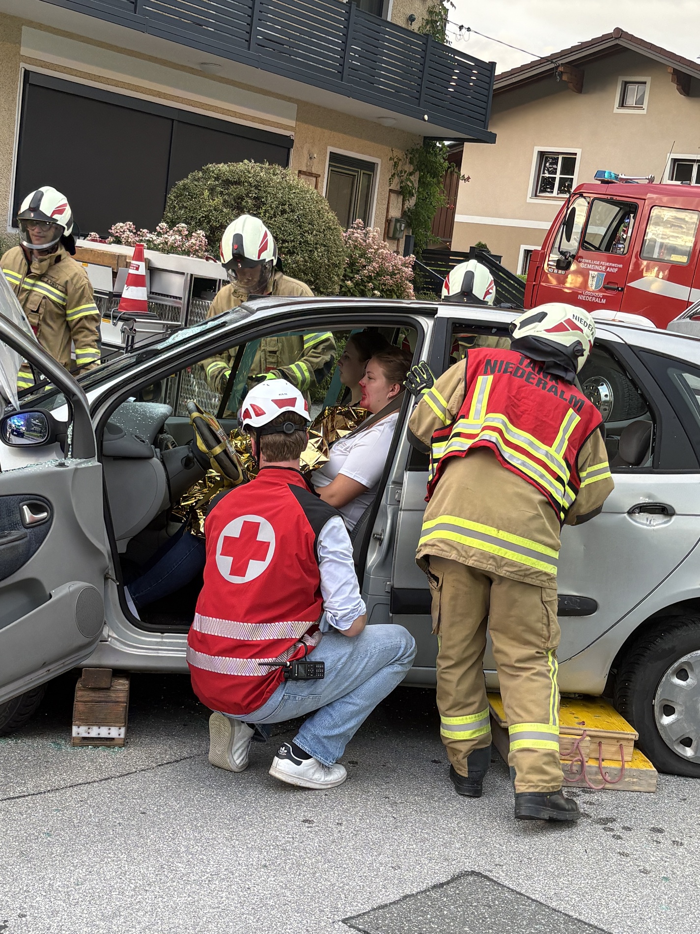 So war er mit seinem Löschzug bei einer Großübung dabei. Damit die Zusammenarbeit zwischen den Feuerwehren der gleichen Alarmstufe und dem Roten Kreuz bei Verkehrsunfällen gut koordiniert wird, werden Situationen möglichst realistisch und praxisnahe nachgestellt. Diesmal: Auf der Landstraße zwischen Anif und Niederalm liegt ein Auto auf der Seite am Straßenrand, ein junger Mann sitzt regungslos am Steuer. Auf der anderen Straßenseite steht ein völlig verbeulter Klein-PKW, im Innenraum sind zwei junge Frauen, eine lehnt blutüberströmt über dem Lenkrad, die zweite hat eine Platzwunde auf der Stirn. Die zwei Fahrzeuge sind kollidiert. Einige Minuten später ist der First Responder des Roten Kreuzes am Ort des Geschehens und verschafft sich blitzschnell einen Überblick. Ebenso rasch sind die Feuerwehr Niederalm und die Freiwillige Feuerwehr Grödig zur Stelle, gefolgt vom Einsatzauto des Roten Kreuzes. Nun geht alles blitzschnell. Mit der Bergeschere wird der Verletzte geborgen und anschließend vom Roten Kreuz versorgt. Auch allen anderen Beteiligten bekommen rasch Hilfe. Mittendrin packen Raphael Oberndorfer und Markus Andechser ordentlich mit an. Die beiden sind 15 Jahre alt und seit sechs Monaten freiwillige Mitglieder beim Löschzug Niederalm. Während sie beim Aufräumen helfen, erzählen sie von ihren Beweggründen, sich ehrenamtlich zu engagieren. „Es ist ein gutes Gefühl, Menschen zu retten und es macht uns auch stolz dabei sein zu dürfen“. Nachwuchssorgen gebe es in Niederalm keine, bestätigt Löschzugskommandant und Stellvertreter des Ortsfeuerwehrkommandanten Franz Schönleitner. Er zeigt sich mit den Leistungen sehr zufrieden und bedankt sich herzlich bei allen für den professionellen Ablauf. Neben seiner hauptamtlichen Funktion des Oberbrandinspektors und Ausbildners an der Landesfeuerwehrschule Salzburg fungiert er beim Löschzug Niederalm als Kommandant. Warum er neben seinem Job auch noch als Freiwilliger arbeitet? Für ihn sei das eine Form von gelebter Nächstenliebe und spricht auch vom Gelöbnis, wenn junge Feuerwehrleute angelobt werden. Darin sei enthalten, dass sie, wenn notwendig, auch ihr Leben einsetzen.
