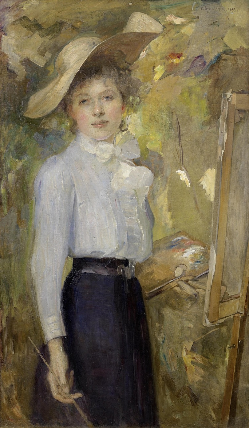Auch die später geborene Susanne Renate Granitsch durfte noch nicht an der Kunstakademie studieren. Um ein fachlich neutrales Urteil zu erhalten und „nicht als Frau erkennbar zu sein“, reichte sie ihre Werke zumindest anonym ein. Auch im Selbstporträt (links oben) präsentiert sie sich selbstbewusst als ernstzunehmende Kunstschaffende: in der damaligen Kleidung arbeitender Frauen mit Pinsel und Palette als deutlichen Zeichen der Malerei als Profession (im Bild unten).