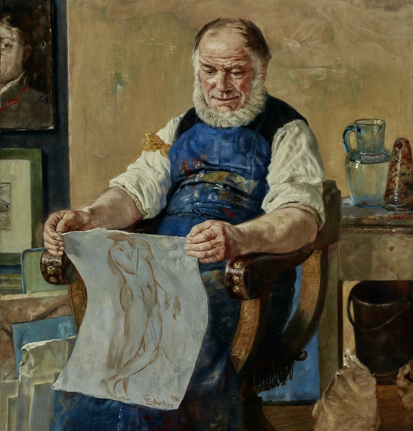 Für die persönlichsten aller Werke zeigen sich die Kunstschaffenden gerne in ihren Werkstätten oder Ateliers, auch die Profession soll gleich erkennbar sein. „In zwei Drittel der hier gezeigten Werke dienen das Malerwerkzeug Pinsel, Palette und Staffelei als berufliche Erkennungszeichen – als Insignien des Künstlertums“, erklärt Kunsthistorikerin Claudia Koch von der Akademie der bildenden Künste Wien.