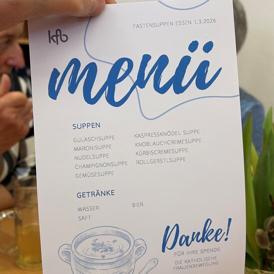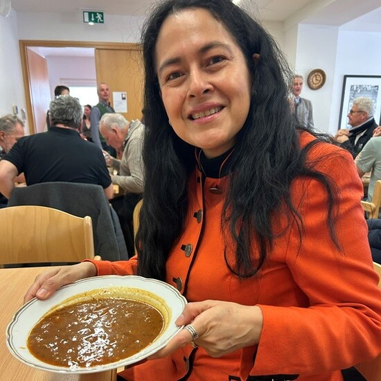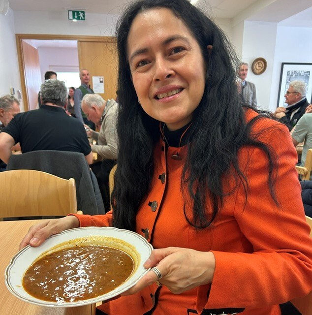 Meine Frauen traf ich diesmal im Pfarrheim von Bad Hofgastein. Obwohl ich zum ersten Mal dort war, war es leicht zu finden: Man folgt einfach dem Kirchturm, den man schon von weitem sieht. Besonders gefreut hat mich, dass ich alles bequem vom Bahnhof dann Bus aus zu Fuß erreichen konnte. Der Weg dorthin war ein Genuss – am frühen Morgen in dieser wunderschönen Landschaft unterwegs zu sein erfüllt einen mit Dankbarkeit. Beim Betreten des Pfarrsaals erwartete mich sofort ein herzliches Willkommen: Die kfb-Gruppenleiterin Greti Gruber stand gemeinsam mit ihrer Tochter bereit, um die Gäste zu empfangen. Diese familiäre, offene Atmosphäre war der perfekte Auftakt für den Fastensuppen-Mittag. Während Greti begrüßte, war ihre Tochter bereits im Einsatz und servierte an den Tischen. Insgesamt wurden zehn verschiedene Suppen gekocht, die je nach Wunsch direkt an den Tisch gebracht wurden. Mein persönlicher Favorit war die Gulaschsuppe – früher oft gekocht, heute leider viel zu selten.