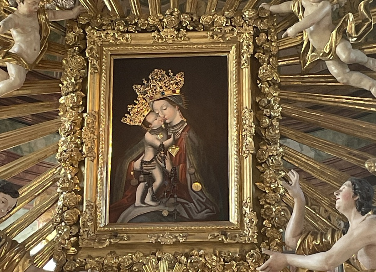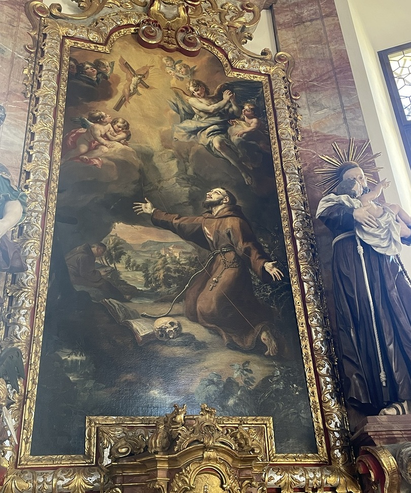 Beim Durchschreiten des Kuppelraumes mit dem barock nachempfundenen Fresko aus dem 20. Jahrhundert fällt der Blick auf den Hochaltar und das von goldfarbenen Rosen umrahmte Gnadenbild „Maria mit dem Kind“ (im Bild oben). Der linke Seitenaltar ist dem heiligen Franziskus geweiht (im Bild unten) – samt Gemälde des aus Laufen stammenden kaiserlichen Hofkünstlers Johann Michael Rottmayr, der 1690 in Maria Bühel geheiratet hat. Eine Darstellung, die uns vom Heiligen Jahr 2025 bereits an das bevorstehende Franziskus-Jahr 2026 denken lässt. Franziskus vor dem Bergkloster La Verna – damit schließt sich für Kirchenrektor Heribert Jäger ein spiritueller Kreis: „Maria Bühel ist der höchste Punkt von Oberndorf und der Berg spielt hier eine besondere Rolle – wie schon bei Jesus, der zum Beten auf den Berg ging.“