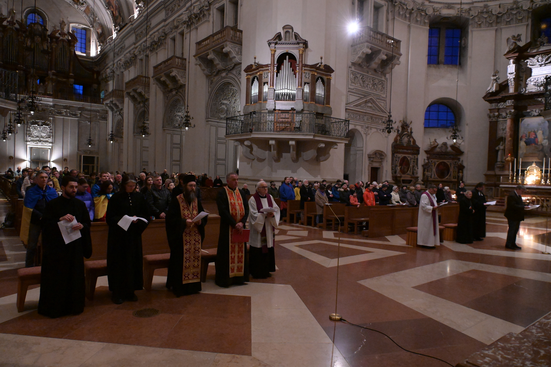 Um 18:00 luden Erzdiözese und die Gemeinde St. Markus zum gemeinsamen Friedensgebet in den Dom. Wie schon zu Beginn des russischen Angriffskrieges wurde das Gebet im byzantinischen Ritus abgehalten; es beteiligten sich Vertreterinnen und Vertreter der verschiedenen in Salzburg beheimateten christlichen Kirchen. Erzbischof Lackner wurde von Generalvikar Roland Rasser vertreten.